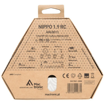 Nippo AHL0013 1.9 RC, to latarka LED nowej generacji. Nowoczesna obudowa kryje solidną konstrukcję oraz dwa źródła światła (główna dioda Cree o mocy 190 lm oraz 4 diody Nichia o ciepłej barwie), jest także odporna na upadki i wodę. Nippo 1.9 RC to nawet 3 dni pracy. Zapamiętuje ostatnie ustawienia, posiada system płynnej regulacji światła – ADS oraz funkcję „Switch Lock” zabezpieczającą czołówkę przed przypadkowym włączeniem.